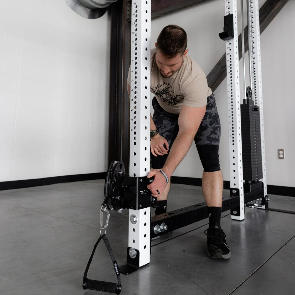 Designed as a dual sided functional trainer inside of a traditional 6-post rack, the 2 and 4 inch aluminum pulley wheels deliver smooth and controlled resistance. With a 2:1 cable ratio the two 250lb weight stacks allow for both unilateral and bilateral training. Using the knurled handles and T-Handle pop-pins, quickly move the trolley up and down the uprights to change movements in a snap. Expand your home gym ecosystem with our best-selling PRx Axis Pad® and Leg Curl/Extension attachments to get all the versatility of a commercial gym without the need for separate, bulky machines.