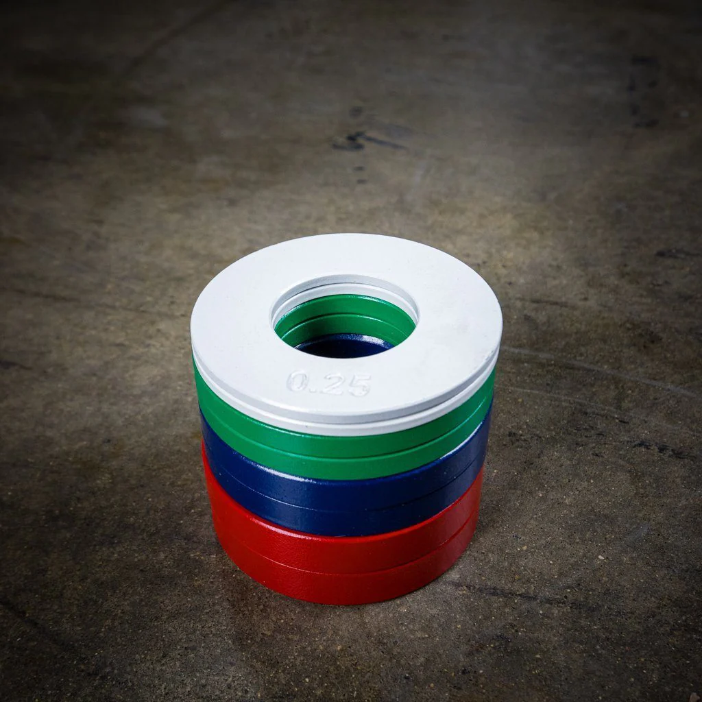 Weights are displayed in kilograms, and pairs are in matching colors for easy grabbing. With a 2" collar opening, these fractionals fit all standard Olympic bars.